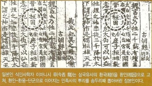 바로 이 점을 악용하여 일본은 환국의 역사를 말살하였습니다. 일제강점기에 한국사를 왜곡시키기 위해 조직된 〈조선사편수회〉 3인방의 한 사람인 이마니시 류今西龍(1875~1932)는 『삼국유사』에 나오는 '석유환국書有桓國'의 '국國' 자 가운데를 쪼아 '인因' 자로 만들었습니다. 그러하여 "옛적에 환국이 있었다(書有桓國)"라는 것을 "옛적에 환인이 있었다(昔有桓因)"로 날조해 버렸습니다.