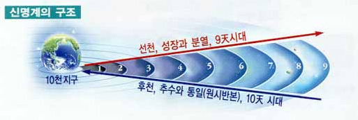 이 9천의 신명계는 1천의 지옥과 2층의 연옥, 그리고 3층 아스트랄계와 4층 순미純美의 세계를 비롯하여, 유교·불교·기독교 등의 기성종교 문명권이 있는 6·7층, 그리고 우주의 최고 주재자이신 증산 상제님께서 선천시대 동안 임어해 계시는 9천의 옥경玉京으로 나뉘어 있습니다.