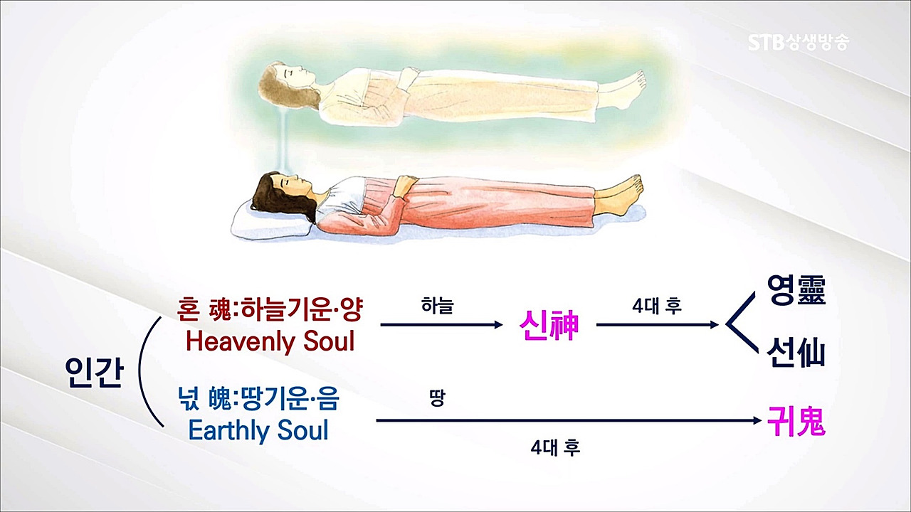 ❋ 사람에게는 혼魂과 넋(魄)이 있어 혼은 하늘에 올라가 신神이 되어 제사를 받다가 4대가 지나면 영靈도 되고 혼 선仙도 되며, 넋은 땅으로 돌아가 4대가 지나면 귀鬼가 되느니라. (道典 2:118:2~4)