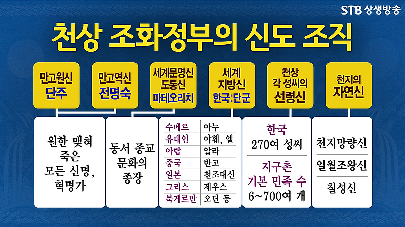 조화정부에는 크게 만고원신萬古寃神과 만고역신萬古逆神, 세계문명신世界文明神과 세계지방신世界地方神, 선령신先靈神이 참여하고 있습니다.