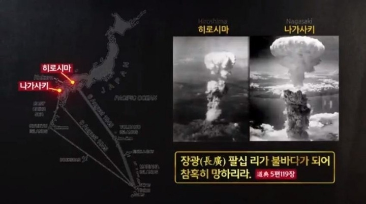 "일본 사람이 미국과 싸우는 것은 배사율(背師律)을 범하는 것이므로 장광(長廣) 팔십 리가 불바다가 되어 참혹히 망하리라."(道典 5:119)라는 말씀도 놀랍다. 長(나가사키)과 廣(히로시마)를 합쳐 장광이고, 두 도시 간 거리는 약 80리, 즉 320km다. 1945년 8월 원폭 투하로 이 말씀은 정확히 실현되었다. 일본 도시 수백 개 중 정확히 이 두 도시, 정확히 이 간격이 선택될 확률은 얼마나 될까? 더구나 상제님께서 이 말씀을 한 1907년 당시 원자폭탄 개념조차 없었다.
